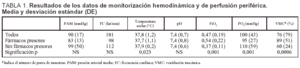Con independencia de las dosis de fármacos utilizados y las posibles asociaciones de los mismos, el estado de la circulación periférica ha sido estimado en nuestra casuística a partir de parámetros que aparecen en la tabla 1. La situación hemodinámica, expresada por la frecuencia cardiaca y la tensión arterial media, no es significativamente distinta en los dos subgrupos (sometidos o no a drogas vasopresoras) de pacientes establecidos, y tampoco lo es el pH que puede ser considerado como indicador de la situación de oxigenación tisular periférica. Si es distinta la temperatura cutánea (axilar) aunque sus diferencias son de menos de 0,2 décimas de ºC y los IC 95% de las medias están comprendidos uno dentro del otro, por lo que puede aceptarse la no relevancia clínica de esta significación.