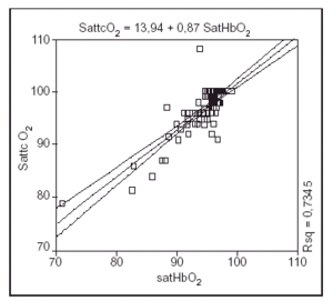 1. En el global de la muestra, la correlación Sattc O2 y SatHbO2 (%) con una R (coeficiente de correlación) de 0,85. El coeficiente de determinación (R2) permite establecer que el 73% de la variabilidad de la SattcO2 se explica en función de las variaciones de la SatHbO2. En la figura 1 se observa la distribución de los datos alrededor de la línea de regresión, así como el intervalo de confianza de la misma del 95%.