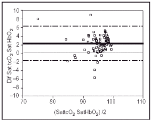 Volviendo ahora a los objetivos descritos, el primero de ellos debe analizarse a la luz de los resultados proporcionados por las figuras 1 a 3. En primer lugar, la correlación existentes entre SattcO2 y Sat HbO2 por un lado y la existente entre SattcO2 y SatO2 por el otro, son muy buenas. Los coeficientes de correlación, que indican la desviación de la pendiente de la línea de correlación respecto a la identidad (bisectriz, R = 1) son, respectivamente, de 0,857 y 0,853.
