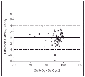 El análisis de las variables " resta" (diferencias entre los valores de la pulsioximetría SattcO2 y los de la saturación de la oxihemoglobina SatHb O2 y entre la SattcO2 y la saturación de oxígeno calculada por el analizador de gases SatO2 ) para el global de la muestra ofrece los siguientes resultados: diferencia media SattcO2-SatHbO2 del 2,31% con una desviación estándar del 2,02% y un IC del 95% de la diferencia media entre 1,64 y 6,27 (rango 7,91) y diferencia media SattcO2 - SatO2 del 0,05%, con una desviación estándar del 2,02% y un IC del 95% entre 3,9 y 4,01 (rango, 7,91). A partir de estos datos se realiza el análisis de correlación y el de concordancia entre las distintas series de determinaciones, y se observa que: