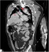 Varón de 49 años con traumatismo toracoabdominal cerrado tras colisión frontal por accidente de tráfico. En la body TAC se objetiva rotura de hemidiafragma derecho con herniación del lóbulo hepático derecho (asterisco) a la cavidad torácica, desplazamiento mediastínico y disección traumática de aorta descendente a la salida de la arteria subclavia izquierda (punta de flecha) en el plano coronal oblicuo (fig. 1) y transversal (fig. 2). Se realizó reducción quirúrgica urgente de la hernia diafragmática y aortografía diferida (fig. 3) con reparación aórtica mediante endoprótesis. La asociación de una rotura hemidiafragmática derecha y una disección aórtica traumáticas es muy inusual. Se asocia a mecanismos de alta energía-desaceleración, son potencialmente mortales y muertes evitables con un diagnóstico y tratamiento precoz.