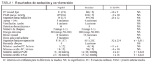 Comparando las características de los pacientes en ambas ramas de tratamiento, tal como es esperable en grupos aleatorizados, comprobamos que no había diferencias en cuanto a edad, sexo, peso, tipo de arritmia, tamaño auricular izquierdo, cardiopatía de base o medicación cardioactiva. Consideramos que la pequeña diferencia encontrada en la fracción de eyección (5%), aunque estadísticamente significativa, no es clínicamente relevante. Dado que la eficacia del procedimiento (restauración del ritmo sinusal) fue idéntica en ambos grupos de tratamiento, podemos centrarnos en los efectos de los fármacos sedantes.
