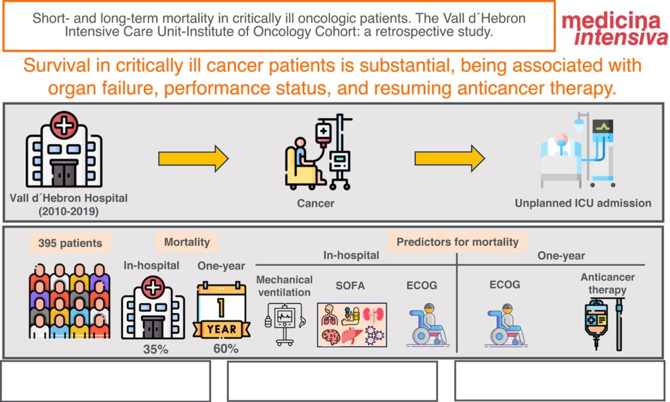 ConclusiónLa supervivencia en los pacientes críticos con cancer es significativa, incluso en presencia de enfermedad metastásica. La mortalidad a corto plazo se asocia al ECOG y la disfunción orgánica, y no al cáncer per se. El pronóstico de los pacientes en los que el SOFA no disminuye el día 5, especialmente si el SOFA inicial era >9, es sombrío. La mortalidad a largo plazo está condicionada por el estado funcional y la continuidad del tratamiento antineoplásico.