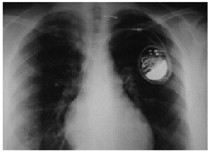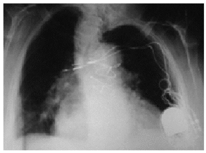 Figura 1. Radiografía posteroanterior de tórax en la que se observan el desplazamiento inferior del generador y el "trenzado" de los cables en el eje vertical. Los electrodos han perdido contacto con el endocardio y están en la zona subpectoral derecha.