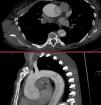 Mujer de 47 años con antecedente de aortopatía bicúspide en abuelo paterno; los padres fallecieron jóvenes en un accidente de tráfico. Por palpitaciones, se solicitó un ecocardiograma ambulatorio, observando un ventrículo dilatado con un diámetro telediastólico del ventrículo izquierdo de 71mm, indexado 3,4mm/m2, fracción de eyección del ventrículo izquierdo del 55-60% además de una válvula aórtica bicúspide con fusión entre los velos coronarianos derecho e izquierdo que condicionaba una insuficiencia aórtica severa (fig. 2) con una raíz aórtica de 40mm. Se solicitó una tomografía computarizada para estudio prequirúrgico (fig. 1) que se realizó tres semanas después, evidenciando una disección aórtica tipoA de Stanford/DeBakeyI con un flap intimal a nivel de la raíz que se extendía longitudinalmente (fig. 3) y de forma espiroidea hasta la arteria ilíaca común izquierda, involucrando el tronco braquiocefálico derecho sin comprometer su flujo. Ante estos hallazgos se trasladó a la unidad de cuidados intensivos cardiológicos para intervención quirúrgica urgente, realizándose cirugía de David con reimplante independiente del tronco braquiocefálico.