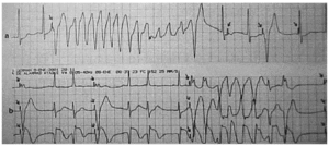 Figura 1. Registros de ritmo electrocardiográfico, una derivación en el caso 1 (a) y tres derivaciones simultáneas en el caso 2 (b), que muestran ejemplos de taquicardias ventriculares polimorfas autolimitadas desencadenadas por las espigas de un marcapasos incidiendo sobre la cúspide de la onda T. Las flechas señalan las "espigas" del marcapasos.