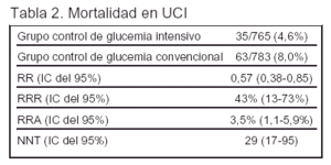 En los enfermos quirúrgicos graves el tratamiento con insulina para mantener glucemias entre 80 y 110 mg/dl reduce la mortalidad en la UCI un 3,5%