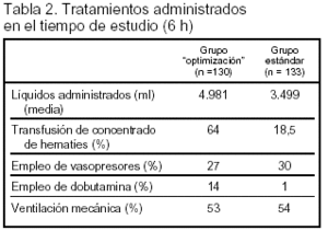 Resultados principales (tablas 2 y 3): los objetivos comunes a ambos grupos (PVC entre 8 y 12 mmHg; PA media ≥ 65 mmHg; diuresis ≥ 0,5 ml/kg/h) fueron obtenidos en el 86% de los pacientes del grupo de tratamiento estándar y en el 99% del grupo de tratamiento de "optimización".