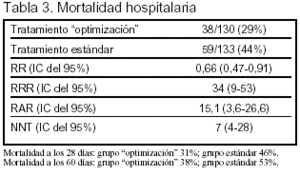 Conclusiones de los revisores: las conclusiones de los autores deben valorarse con precaución. El análisis de ambos grupos demuestra que los enfermos del grupo con tratamiento estándar recibieron en las primeras 6 horas menos líquidos, y alcanzaron PVC y PA inferiores a las del grupo con tratamiento "optimización", sin que este hecho estuviera justificado por las diferencias en los protocolos de tratamiento, ya que los objetivos terapéuticos iniciales en ambos grupos fueron iguales. Este hecho sugiere que los enfermos del grupo de tratamiento estándar fueron "infrarresucitados" en comparación con los del otro grupo. A favor de esta hipótesis está el hallazgo de que 18 enfermos del grupo con tratamiento estándar no alcanzaron los objetivos terapéuticos iniciales en comparación con uno en el grupo con tratamiento "optimización". Tampoco resultan evidentes las razones por las que los enfermos del grupo "optimización" estuvieron 2 h más en el servicio de urgencias. Otros ensayos clínicos en los que se evaluaron protocolos con objetivos terapéuticos definidos (índice cardíaco, Sv O2) no demostraron reducción de la mortalidad. Las diferencias en los resultados con este ensayo clínico no están suficientemente explicadas, salvo por el posible efecto beneficioso del inicio temprano del tratamiento de estos enfermos. También es difícil precisar qué maniobras de las utilizadas en el tratamiento de los enfermos incluidos en el estudio (administración de fluidos, vasopresores, hematíes o dobutamina) son responsables de la reducción de la mortalidad observada.