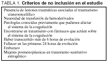 Durante un período continuado de 28 meses realizamos un estudio prospectivo de los pacientes ingresados por presentar un TCE aislado con menos de 6 horas de evolución en el momento del ingreso. Los criterios de exclusión se muestran en la tabla 1.