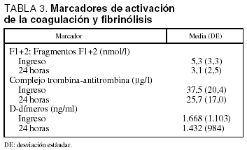 En la tabla 3 se expresan los resultados de las pruebas hemostáticas en las dos determinaciones realizadas. Estos resultados muestran que en la determinación a las 6 horas todos los parámetros estudiados tuvieron unos niveles más altos que los alcanzados en la determinación realizada a las 24 horas.