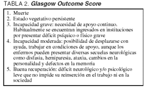 Para la valoración de resultados clínicos hemos empleado el GOS (tabla 2). Dicha valoración se ha realizado a los 6 meses de producirse la lesión encefálica, mediante encuesta telefónica con el paciente o con un familiar directo. Se consideró mala evolución (puntuaciones 1, 2, 3) las respuestas correspondientes a muerte, estado vegetativo persistente e incapacidad severa, y buena evolución (puntuaciones 4,5) las correspondientes a incapacidad moderada y recuperación total.