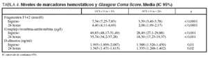 El hallazgo de niveles más altos en los pacientes con puntuaciones más bajas de GCS al ingreso implicaría que un mayor estado de activación del sistema de la coagulación se asociara con un mayor deterioro neurológico inicial, hecho que podría deberse a que las lesiones encefálicas fueran en estos pacientes más intensas. De igual modo, la asociación de valores más elevados de los marcadores de hipercoagulabilidad en los pacientes que presentan una mala evolución posterior indicaría que los pacientes que tienen un estado de hipercoagulabilidad más intenso evolucionan de forma desfavorable.