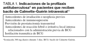 Se recomienda suspender el tratamiento con BCG y administrar isoniacida 300 mg/d durante 3 meses en pacientes tratados con instilaciones de BCG intravesical que presenten fiebre superior a 39,5º C sin foco aparente que no cede con antitérmicos al cabo de 12 horas. En el caso de la neumonitis granulomatosa o hepatitis se recomienda la suspensión de las instilaciones de BCG y el tratamiento con isoniacida 300 mg, rifampicina 600 mg y etambutol 1.200 mg diarios durante 6 meses. La sepsis es la complicación más grave y puede asociarse a shock, coagulación intravascular diseminada o fallo multiorgánico. Es obligatoria la suspensión de la administración con BCG, y establecer tratamiento con isoniacida, rifampicina y etambutol, añadiendo 500 mg de cicloserina dos veces al día por vía oral durante 5 días. Se recomienda el uso combinado de corticosteroides (40 mg de prednisolona al día) con tuberculostáticos, por aumentar la ratio de supervivencia1. Las indicaciones de la profilaxis con 300 mg diarios por vía oral durante 3 días de isoniacida se describen en la tabla 1. El tratamiento con BCG está contraindicado en pacientes con tuberculosis activa, inmunodeprimidos y gestantes11.