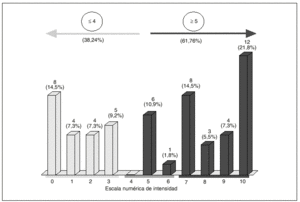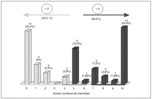 Uno de los intereses de la encuesta era conocer cómo percibía la familia los distintos aspectos ambientales en nuestra unidad: ruido, iluminación, comodidad de la cama e intimidad. Para ello se les presentó una escala de puntuación de 0 a 10. El 61% de los familiares consideró que el nivel de ruido de la unidad estaba por encima del grado óptimo o de seable (fig. 2). Respecto a la iluminación, el 65% expresó que la luz natural que reciben los pacientes es la adecuada; el 34% de las familias descontentas con respecto a la iluminación podría relacionar se con que 2 habitaciones tienen ventanas más pequeñas (fig. 3). Preguntados sobre la comodidad de la cama (ya que éstas son articuladas), el 73% de los familiares estaba satisfecho sobre este punto, y destaca que el 42% puntuó el máximo de 10 (fig. 4). Respecto al grado de intimidad de los pacientes, el 56% de los familiares consideró que no preservamos la intimidad de nuestros pacientes (fig. 5).