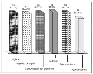 Igualmente se intentó conocer cómo era la relación con los profesionales de enfermería. Sólo el 40% de los encuestados conocía el nombre del profesional de enfermería que atendía a su familiar (a pesar de que es el mismo profesional durante todo el ingreso). El 87% no sabía a quién se hubiera dirigido en caso de haber existido algún problema (supervisora, jefe de sección, etc.). Pero a pesar de que sólo un pequeño porcentaje de familiares conocía el nombre del profesional de enfermería, consideraban que la relación con el personal de enfermería había sido fluida en el 70% de los casos. Respecto a si los familiares se habían sentido informados acerca del proceso de cuidados habituales que se realizaba al paciente por parte del personal de enfermería (higiene, integridad de la piel, nutrición que recibía, grado de comunicación que podían establecer con el enfermo, el estado de ánimo del paciente y la posibilidad de disponer de ayuda espiritual), se detallan los resultados en la figura 6.
