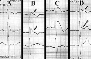 Figura 1. Derivaciones precordiales: de arriba abajo: V1-V2-V3. A: ritmo sinusal. Bloqueo de rama derecha. B: imagen de bloqueo de rama derecha con elevación del ST de tipo coved (flechas). C: tras la administración de 1 ampolla de flecainida IV. D: elevación del ST en V1 tipo coved (flecha) y elevación del ST en V2 tipo saddle-back (flecha y asterisco).