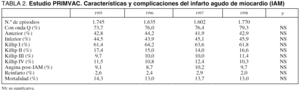 La evolución de las características y complicaciones más importantes del IAM se observan en la tabla 2, en la que destaca la ausencia de variaciones significativas en las variables consideradas.