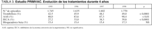 En la tabla 3 se señalan los cambios en la utilización de los fármacos considerados. El uso de los fármacos trombolíticos se incrementó significativamente (p < 0,0001) desde el 42,5 al 49%. La administración de AAS pasó del 88 al 90% (p < 0,01) y de los IECA del 27,2 al 39,8% (p < 0,0001). No se observaron variaciones significativas en el uso de BB.
