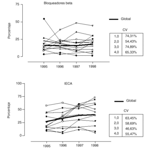 Fig. 2. Evolución del tratamiento con bloqueadores beta e inhibidores de la enzima conversiva de la angiotensina (IECA) en los hospitales del PRIMVAC durante 4 años. CV: coeficiente de variabilidad.