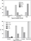Fourteen ICUs (33.3%) adopted the RIFLE scale, while one Unit (2.4%) incorporated the AKIN system, and two Units (4.8%) adopted both scales. In contrast, 25 Units (59.5%) admitted that they applied neither system. Again in this case there was no correlation between the type of Unit and the use of the different scales, though there were differences referred to the type of hospital (p<0.05) (Fig. 2).