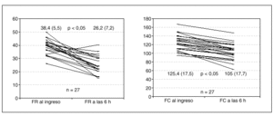 Obtuvimos diferencias significativas en el aumento de la relación PaO2/FiO2 que fue de 116,1 (23,5) frente a 232 (63,8) (fig. 1), en la reducción de la frecuencia respiratoria, que fue de 38,4 (5,5) frente a 26,2 (7,2) y en la FC, de 125,4 (17,5) frente a 105 (17,7), comparando los datos desde el ingreso y tras las primeras 6 h de iniciada la asistencia no invasiva (fig. 2).