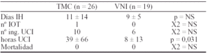 De los pacientes que ingresaron en UCI, los que habían recibido VNI prehospitalaria precisaron menos días de ingreso en UCI (1,3 ± 0,5 vs 4,3 ± 2,7; p = 0,007) y menos horas de VNI (1,5 ± 1,4 vs 10,1 ± 11,3) que el grupo TMC.