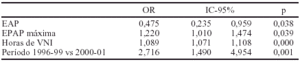 Conclusión: La aplicación de VNI produce complicaciones en un porcentaje elevado de pacientes. Los factores asociados son la mayor duración de la VNI, la etiología de la IRAH, la necesidad de EPAP elevadas y la realización de la técnica durante los primeros años de aplicación.