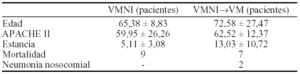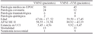 Conclusiones: La VMNI se aplicó a un grupo de enfermos con unos índices de gravedad similares al resto de enfermos ventilados, predominó la insuficiencia cardíaca y coronaria como patología de base, consiguiendo la retirada del apoyo ventilatorio antes que el grupo general de enfermos intubados y una estancia media más corta. El no encontrar ninguna diferencia respecto a las complicaciones o gravedad y si en los resultados globales puede ser influido por que se aplique a un grupo de enfermos que se espera una evolución más favorable o reversible a corto plazo.