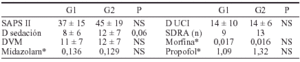 Metodología: Estudio prospectivo caso/control de una serie de pacientes sometidos a VM y que precisaban sedación e.v. continua durante al menos 24 h (G1) comparados con un control histórico (G2) en una UCI de 6 camas polivalentes. Criterios de exclusión: alergia a los fármacos utilizados, embarazo y enfermedad neurológica. La sedación se realizó con midazolam y/o propofol, siempre asociados a morfina, según protocolo establecido. La monitorización del nivel de sedación la escala de Ramsay (R). Variables estudiadas: Edad, SAPS II, días de sedación, días de estancia en UCI (D UCI) días de VM (DVM), motivo de ingreso, comorbilidad, dosificación media (mg/Kg/h), complicaciones y eventos adversos. Análisis entre grupos mediante la prueba de t-Student y comparación de variables categóricas con la prueba de χ2.