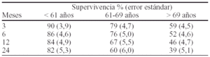 Resultados: El 80% fueron varones (IC 75-84). Desarrollaron el evento (éxitus) el 48%. El seguimiento máximo fue de 175 meses; la mediana de seguimiento de los casos censurados fue 20 meses. La mortalidad en UCI fue de 15% (IC 11-19), y la hospitalaria de 25% (IC 20-31). Con la aplicación de la regresión de Cox a las categorías en cuartiles y deciles de la distribución por edad, se identificaron los puntos de corte que mejor discriminan los grupos de edad por su pronóstico: 1) Menores de 61 años (grupo referencia). 2) De 61 a 69 años, con razón de tasas de riesgo ("hazard ratio" HR) de 2,8 (IC 1,5-5,4) respecto a los menores de 61. 3) Mayores de 69 años con HR 5,3 (IC 2,8 10,1) respecto al grupo de referencia.