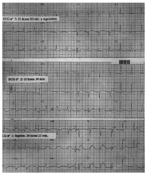 Fig. 1. ECG 1: en el ingreso, ritmo sinusal a 80 lat/min, QTc de 384 ms y signos de lesión subepicárdica anterior. ECG 2: tras 2 h 20 min, se inicia la normalización del ST en cara anterolateral y el QTc se prolonga a 471 ms. ECG 3: 3 h después del segundo, persisten cambios en I y aVL, con un QTc de 494 ms.