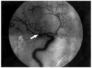 Fig. 2. Arteriografía cerebral: aneurisma de 5 mm de diámetro (flecha) en la bifurcación de la arteria cerebral media derecha.
