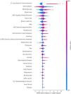 SHAP summary plot with the aggregated SHAP values generated in each iteration of the cross-validation. SHAP analysis was carried out for the CEGB estimator. Each cloud of points represents the data points of the aggregated test splits among the iterations of the cross-validation. The horizontal axis shows the SHAP values assigned to every data point. If the magnitude is higher, the influence is greater. If the value is positive, the influence is positive (induces to predict cardiac arrest). If it is negative, such is the influence (induces to predict no cardiac arrest). As there is a SHAP value assigned to every variable of every data point, the clouds are grouped by variable. The variables are sorted in a descending overall importance ranking. The overall importance of a variable is established by the average magnitude of its SHAP values among all the data points. Finally, the colour of each point in a cloud represents the original value of the variable of such point. If the variable has a low value in a data point, such point will be coloured in blue in the cloud of the variable in question. Inversely, if the original value is high, the colour will be red.