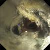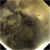 Paciente de 44 años con antecedentes de VIH estadio sida y linfoma B tipo Burkitt que ingresa en la UCI por insuficiencia respiratoria con neutropenia de 80cél/μl. Se realiza fibrobroncoscopia con el hallazgo de extensas lesiones exofíticas blancas-negruzcas (fig. 1, asterisco rojo), muy sugerentes de hifas (fig. 2, asteriscos azules), que tapizan la totalidad de la tráquea (vídeo 1), la carina y los bronquios principales (vídeo 2), iniciándose doble tratamiento antifúngico con anfotericina B y caspofungina. Se confirma en el lavado broncoalveolar la infección por Aspergillus fumigatus. La micosis presenta mala evolución, con afectación necrosante de la mucosa, progresando hacia fistulización traqueoesofágica y rotura traqueal que ocasionó el fallecimiento del paciente.