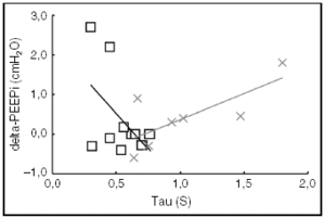 Figura 2. Relación entre la constante de tiempo (tau) y el cambio de auto-PEEP estática tras cambiar la frecuencia respiratoria (delta-PEEPi). Síndrome de distrés respiratorio agudo (SDRA) (r = 0,5, p = 0,1), x enfermedad pulmonar obstructiva crónica (EPOC) (r = 0,73, p = 0,06).