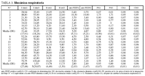 El paciente inicialmente fue ventilado con flujo inspiratorio constante, de forma controlada, FiO2 de 1 y PEEP = 0. En pacientes con insuficiencia respiratoria crónica agudizada (IRCA), el volumen de la corriente inicial era de 10 ml/kg, y de 8 ml/kg en el grupo con lesión pulmonar aguda. Después de monitorizar la presión en la vía aérea modificamos el volumen y la frecuencia respiratoria para evitar una sobredistensión del sistema respiratorio11 y acidemia respiratoria (tabla 2). Para medir la constante de tiempo y la mecánica respiratoria realizamos 3 registros de presión en la vía aérea y de flujo durante 40 s. Manteniendo el volumen por minuto constante, cambiamos a la frecuencia respiratoria calculada según la constante de tiempo, y después de 15 min repetimos las mediciones.