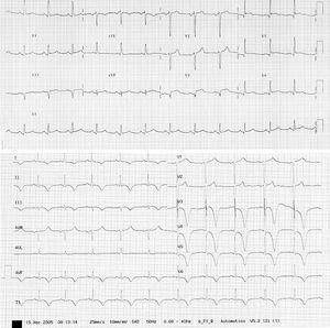 Figura 1. Electrocardiograma (ECG) de una paciente de 57 años durante el episodio agudo de disfunción del ventrículo izquierdo, donde se aprecia una elevación del segmento ST en la serie precordial e inferior (trazado ECG en la parte superior) y su evolución con el desarrollo de isquemia subepicárdica (trazado ECG en la parte inferior) y aparición de inversión de la onda T.