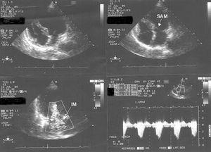 Figura 2. Ecocardiograma transtorácico realizado en un plano apical de cuatro cámaras donde se aprecia la geometría del tracto de salida de ventrículo izquierdo (TSVI) con movimiento anterior sistólico de la válvula mitral (parte superior), insuficiencia mitral significativa y gradiente elevado en el TSVI (parte inferior).