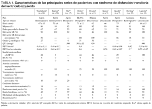 El síndrome de apical ballooning o abalonamiento, también conocido como síndrome de discinesia apical transitoria (SDAT) o cardiomiopatía de Takotsubo ha sido descrito recientemente. Los primeros casos aparecen en la población japonesa durante los años noventa1,2, aunque es en el año 2001 cuando se consolida como entidad independiente, describiéndose por Tsuchihashi et al de nuevo en Japón la primera serie de 88 pacientes3. Posteriormente, se han documentado más series de casos en EE.UU.4, Bélgica5 y en los últimos años también en otros lugares, de lo que se deduce que no existe asociación con determinadas áreas geográficas o grupos étnicos6-20. Del análisis de los casos descritos en las principales series publicadas (tabla 1) se infieren las principales características diferenciales del SDAT2-5,7,16-18: tiene lugar en mujeres de mediana edad (entre 50 y 70 años) y está precedido de un estrés físico o psíquico que actúa como desencadenante.
