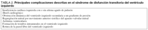 Aunque las alteraciones son por definición reversibles y el pronóstico habitualmente bueno, pueden existir en la evolución complicaciones como arritmias, insuficiencia cardíaca, estenosis subaórtica dinámica, shock cardiogénico, accidente cerebrovascular de origen embólico e incluso muerte (tabla 2)3,28-32.