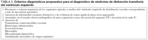 Se han empleado numerosos y diversos criterios en las diferentes series publicadas, sin embargo, y con las implicaciones terapéuticas que ello supone, aún no existe una definición de consenso del mismo. Conscientes de ello, y para facilitar su rápido reconocimiento, algunos autores como Abe18,33 y posteriormente Bybee de la Clínica Mayo19,34, proponen cuatro criterios basados fundamentalmente en su presentación clínica (tabla 3), para discriminar fácilmente este síndrome de otras patologías como el IAM: