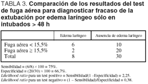 Con estos datos, la conclusión es que, en los enfermos intubados > 48 h, un test de fuga aérea < 15,5% es 2,25 veces más probable en pacientes que requerirán reintubación por edema laríngeo que en los que no lo presentarán. Por el contrario, un test de fuga aérea ≥ 15,5% es tres veces (la inversa de 0,38) más probable en pacientes que no precisen reintubación por edema laríngeo. Para ponerlo en perspectiva, se suele requerir una LR(+) > 5 y LR() < 0,10 para que un test se considere realmente útil para tomar decisiones clínicas.