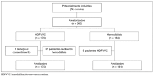 Artículo: Vinsonneau C, Camus C, Combes A, Costa de Beauregard MA, Klouche K, Boulain T, et al. Hemodiafe Study Group. Continuous venovenous haemodiafiltration versus intermittent haemodialysis for acute renal failure in patients with multiple-organ dysfunction syndrome: a multicentre randomised trial. Lancet. 2006;368:379-85.