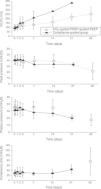 Concerning respiratory parameters, we found that there was no difference in mean PEEP at study entry between compliance-guided group and FiO2-guided PEEP group on moderate and severe ARDS (complete data of respiratory variables during the study are shown in supplementary material). Among the patients with moderate ARDS, there were no differences on compliance, peak and plateau pressures or oxygenation during the study (Fig. 2). However, among patients with severe ARDS, there was a trend toward better oxygenation in the compliance-guided group beyond first day of study, without differences in respiratory pressures (Fig. 3). It is important to remark a strong trend to lower driving pressure between patients included in compliance-guided PEEP adjustment group in both groups of severity of ARDS.