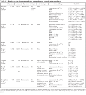 La embolización de placas de ateroma o restos de calcio desprendidos durante la manipulación quirúrgica o las embolias secundarias a arritmias cardíacas durante el período postoperatorio han sido las causas más frecuentemente reconocidas de los ictus detectados durante el postoperatio de cirugía cardíaca. Los ictus precoces, manifestados durante las primeras horas de la cirugía como déficits sensitivo-motores (pudiendo coincidir con un despertar en estado estuporoso o comatoso, o incluso que el paciente no se despierte o que presente crisis convulsiva durante el postoperatorio más inmediato), son los más frecuentes, y han sido atribuidos a embolias intraoperatorias o períodos de hipoperfusión cerebral grave. Cuando la manifestación del ictus es más tardía, la causa más frecuente son las arritmias cardíacas (siendo la fibrilación auricular la más habitual)1,6,7 o el desprendimiento de fragmentos de placas de ateroma aórtico14.