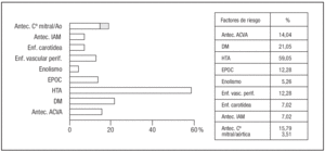 Figura 1. Factores de riesgo.Antec. ACVA: antecedente de accidente cerebrovascular agudo; Ao: aórtica. Cª: cirugía. DM: diabetes mellitus; Enf. vasc. perif: enfermedad vascular periférica; EPOC: enfermedad pulmonar obstructiva crónica; IAM: infarto agudo de miocardio; HTA: hipertensión arterial.