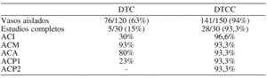 Conclusiones: Según nuestros resultados el DTCC mejora el porcentaje de insonación de las arterias del Polígono de Willis respecto al DTC fundamentalmente de la ACI y de la ACP.