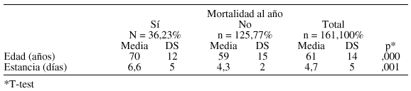 Conclusiones: La mortalidad al año del ingreso en una UCI está relacionada con mayor edad, gravedad de enfermedad motivo de ingreso, presencia de riesgo social y deterioro en calidad de vida al ingreso, con no tolerancia al ejercicio físico junto a estado anímico depresivo.