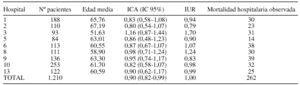 Resultados: Se incluyeron en el estudio 1.210 pacientes. Su edad media fue de 61,86 años (de 16,50 años). Setecientos setenta y tres pacientes (63,8%) eran médicos, 324 (26,8%) eran quirúrgicos y 114 (9,4%) eran traumatológicos. La mediana de la estancia fue de 3,06 días. La mortalidad en la UCI fue de 190 pacientes (15,7%). La mortalidad hospitalaria fue de 262 pacientes (21,6%).